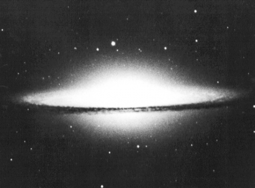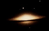 Галактика Сомбреро - спиральная галактика с характерным слоем темной пыли, скрыыающим от нас ядро звездной системы. M104 наклонена лишь на 6╟ от линии идущей вдоль луча зрения. Центральная часть галактики хорошо заметна (сильно выступает) - M104 похожа на элиптическую галактику со спиральными рукавами. |