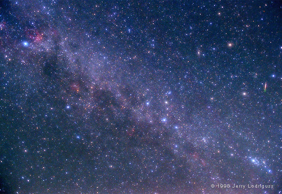 Перед Вами тот участок Млечного Пути, который хорошо виден осенью. Вы можете на этом снимке отыскать созвездия Кассиопеи и Цефея. В правом нижнем углу на снимок "залез" Персей, в верхнем левом - Лебедь. Справа вверху "выглядывает" Андромеда.