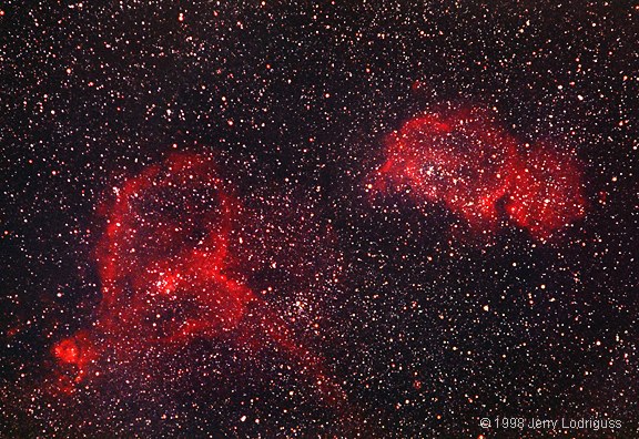 Излучающая туманность IC 1805 светит за счет излучения находящихся в ней звезд, которые разогревают газ туманности.