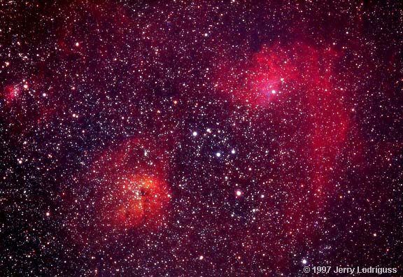 Излучающая туманность IC 405 светит за счет излучения находящихся в ней звезд, которые разогревают газ туманности. Туманность находится в созвездии Возничего. Слева Вы видите меньшую туманность того же типа - IC410