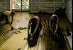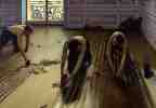 "The Floor-scrapers" or "Floor-strippers". Probably painted in the family home in the Batignolles area. It is typical of Caillebotte's taste for unusual perspectives and scenes from modern life, including so humble an occupation as floor scraping.