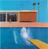 A Bigger Splash was painted in Califomia in the early summer of 1967. It is a record of a typical warm, sunny, cloudless day; from the position of the shadows cast by the eaves of the building and the chair, it appears to be midday when the sun is highest in the sky and the heat is most intense. The solitary figure, who has just dived into the pool, has been deliberately overwhelmed by the strength and composure of the rest of the composition. The hidden depths of this picture take longer to assimilate than its immediate joyful and decorative appeal...