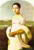 The third of the Riviere family portraits is that of the fifteen year-old girl whom Ingres referred to as the "ravishing daughter." Unlike the portrait of her mother, this image of femininity seizes a quality of youthful candor just on the brink of a womanhood that Mlle. Riviere, who died that very year, was never to know. The sunlit openness of the spring landscape, the simplicity and slight stiffness of the stance, the natural ruddiness of cheeks and lips, the dazzling whiteness of the dress and swan's-down boa (which offended those 1806 Salon critics accustomed to a darker, more shadowed palette)--such elements create a purity and innocence foreign to the atmosphere of cultivated artifice and sensuality in Ingres's portraits of mature women. Appropriate to the age of the sitter, Mlle. Riviere's sensuality is nascent rather than overripe. Indeed, the chiseled clarity of the head, centered beneath the arcing upper frame, smacks of something strangely archaic. The staring, almond-shaped eyes; the fixed smile; the stylized geometries of hairline, eyebrows, earlocks- all recall an early moment in an artistic cycle, whether Egyptian, archaic Greek, or Italian quattrocento.