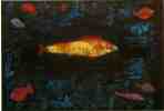 The Golden Fish glides through the kingdom of its underwater freedom, all lesser fish leaving a clear space for its gleaming body. This is a magical fish with runic signs upon his body, scarlet fins, and a great pink flower of an eye. He hangs majestically in the deep, dark blue magic of the sea, which is luminous with secret images of fertility. The great fish draws the mysteriousness of his secret world into significance. We may not understand the significance, but it is there. The sea and its creatures are arranged in glorious homage, belittled but also magnified by this bright presence. This quiet nobility, the brightness, the solitude, the general respect: all are true of Klee himself. Whether the art world knew it or not, he was their ``golden fish''.
