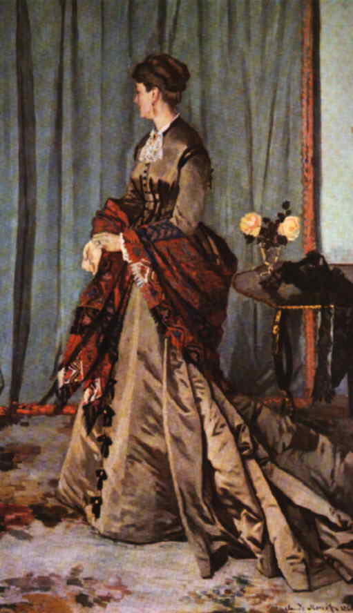 The portrait of Madame Gaudibert, painted in a chateau near Etretat, is none the less distinguished for being in a quiet key. The lady's dress was of that dull satin that offered little scope to the colourist but Monet gives dignity to its folds and adds color--discreetly subdued--in shawl, carpet and curtained background that lightens the effect. This is further enlivened by the touches of white at collar and cuffs and in the design of the shawl. Head and hands are painted with a sensitive simplicity.