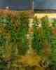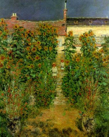 This is one of the flattest landscapes ever painted. At around the same time, Cezanne was flattening his still lifes by distorting the tables to a vertical orientation. Monet stops short of distortion through a judicious choice of subject. A hillside staircase provides the form for a dramatic flattening of the painting. Monet accentuates this effect with a strong dividing line going up the right side of the stairs, between the houses and continuing up the chimney to the top of the canvas. The sky and buildings are highly geometrized forms whose flatness serves to bring the deepest part of the composition back up to the picture plane. The stairs are not individually distinguishable; if not for the children placed on them, they could be read as a cliff. The children themselves are frozen in full frontal portrayal, which again contributes to the flattening effect. There are few perspectival clues provided. No clouds are shown that would break up the solid plane of dark blue sky. No shadows can be discerned, even though the scene is bathed in sunlight. This results in a number of interesting ambiguities. Are the buildings next to each other, nearly touching? Or is one or the other to be perceived as in front? The structure on the left seems to be directly at the top of the stairs. But the blue roof on the right draws a line across the pink roof that brings it abruptly forward, hanging precariously over the hillside. Even the sunflowers are puzzling. The blossoms do not diminish in size as would be expected as they near the top of the canvas. As a result, they can be read either as a wall of plants at the base of the staircase, or as rows of vegetation terracing the hillside. This work, so unlike much of Monet's work in its flat plane composition, is a testament to the breadth of his oeuvre.