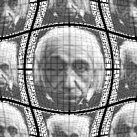 This one will displace an image with curvature...Notice how it actually wraps 360 degrees and creates a complete circle out of the side edges! This is also a good example of the value of the standard test grid. You can readily see that the center portion is spatially warped, but relatively intact.