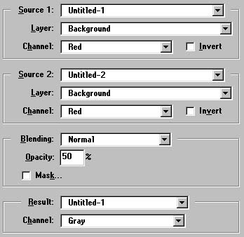 Again, go to Image/Calculations (make sure Untitled-1 is active window) and use same settings but Source-2 to Untitled-3.