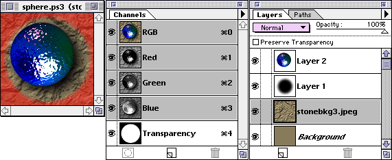 As before, we copy the original alpha mask into our working image as a new channel. Open the image "dither.gif", select "all", and choose "edit/define pattern". Go to the transparency channel, and choose "edit/fill", but with some slightly different settings. Choose "pattern", 100%, and *Multiply*. This will fill the white part of the mask with the dither. We could stop here, and this would give us the 'ghost' image at the top right. I'd prefer the sphere to remain solid, so here's what you do. Go to the layer that has the sphere on it, select "all", and use the arrow keys to push it one pixel right, and one pixel left. This selects just the sphere, with nothing moved. Go to the menu, and choose "select/modify/enlarge", and choose 1 pixel. Go back to the mask channel, and fill this area with white. That's our mask as above. Reduce to indexed color, and save as GIF89a specifying "alpha mask" for the transparency. Neat, huh?