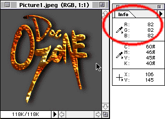 Now, one of the big tricks here involves the translation from RGB mode to Indexed Colors. First, make sure your Info palette is open. Note down the RGB values you've chosen for your background. Now translate to Indexed Color, choosing adaptive palette and dithering. DON'T DO ANYTHING ELSE YET! Move your cursor over your background. If you're lucky, the RGB values will stay the same, and you're ready to move on to the next step. About half the time Photoshop will have decided to dither the background on you. Note down the 2 colors it chose to dither together and hit Command-Z to undo the mode change. Now we change modes back again, this time choosing 'custom' palette and dithering. (The first abortive attempt to change mode was necessary to set the palette to the correct colors.) Click on the colors until you locate one of the 2 colors PS originally tried to dither together, and change it to the same as your original background. Click OK, and with any luck we'll now have a smooth, one color background. It's rare you'll have to do this twice, but it's always safer to have a copy of your file, in case you go too far, and can't undo the mode change. NOTE: changing *back* to RGB is not the same as un-doing the mode change. Once it's dithered, it's dithered. |