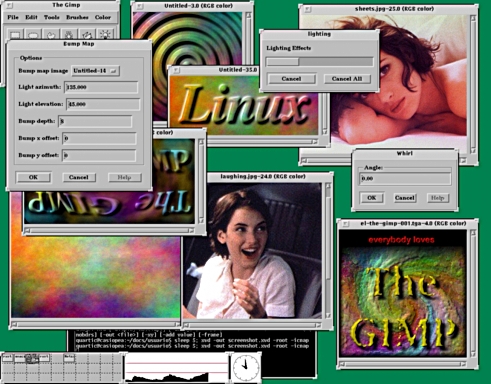 I have prepared a nice screenshot of The Gimp in action. The platform used was a no-name 486DX2/66 MHz, 16 MB RAM, 1 MB CL/GD5420 video card, running Linux 1.2.13. You can download the small version (172 KB) or the big full-sized version (890 KB (yikes!)).
