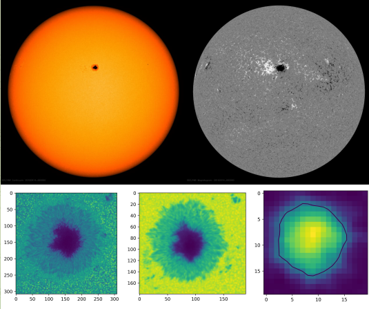 В докладе будет представлена зависимость яркости в континууме от магнитного поля солнечных пятен. В качестве наблюдательного материала использованы данные инструмента HMI (Helioseismic and Magnetic Imager), расположенного на борту SDO (Solar Dynamics Observatory) и HINODE. В полученной зависимости отчетливо проявляется эффект подавления конвекции магнитным полем: с ростом напряженности поля яркость уменьшается, что вызвано более сильным подавлением конвекции. Подтвержден эффект насыщения: при тех магнитных полях, которые обычно наблюдаются в солнечных пятнах, с дальнейшим ростом магнитного поля (больше 2600 Гс)