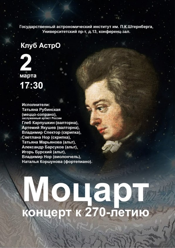 Клуб АстрО Московское общество любителей музыки Моцарта Государственный астрономический институт им. П.К.Штернберга, Университетский пр-т, д.13, конф-зал 27 января 2026 года; вторник в 17 ч. КонцертМузыка Моцарта в День его 270-летия