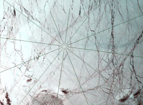 Explanation: Orbiting over the north pole of planet Earth on May 5, the MODIS instrument on-board the Terra spacecraft, recorded this view of the ice cap 700 kilometers below. A radial grid centered on the pole is shown on top of the approximately true color image where each pixel covers about one square kilometer. Frozen sea ice appears whitish while open water or newly refrozen ice looks black. An impressive criss-crossing network of cracks in ice shifting above a liquid water ocean is visible, traced by the meandering dark lines. In fact, the dark network of cracks in the sea ice is reminiscent of another world in our solar system which may also harbor a liquid water ocean -- Jupiter's ice moon Europa.