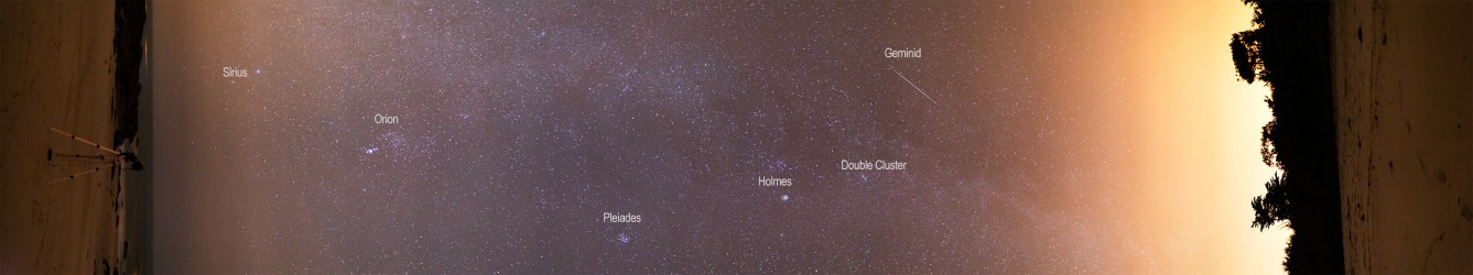 Explanation: Scroll right and journey from horizon to horizon as your gaze sweeps through the zenith in the night sky over Beg-Meil, France. Recorded on December 13th, the entertaining panorama (image key) covers 210 degrees in 21 separate exposures, beginning on the beach with bright star Sirius rising in the southeast. Look up (pan right) to encounter the nebula rich constellation of Orion and continue on to find the lovely Pleiades star cluster. Farther along, higher in the sky, is the famous Comet Holmes, still gracing the northern hemisphere's night with its remarkable expanding coma. Finally, just before diving into the urban glow from city lights along the northwestern horizon (far right), check out the double star cluster in Perseus and take in the cosmic streak of a bright Geminid Meteor.