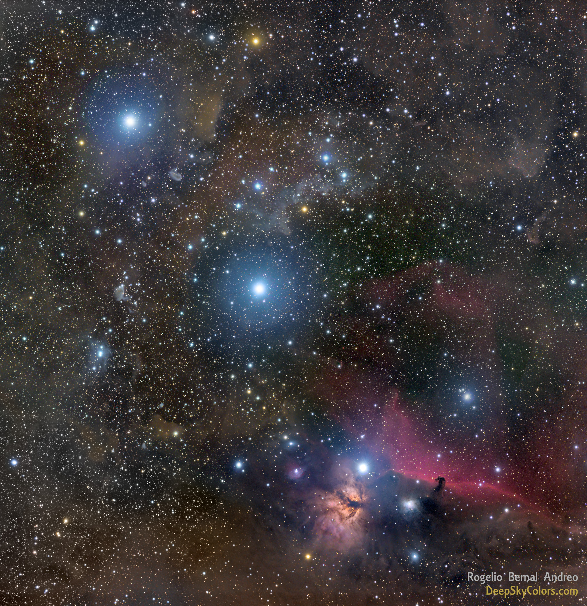 Explanation: Alnitak, Alnilam, and Mintaka, are the bright bluish stars from east to west (lower right to upper left) along the diagonal in this gorgeous cosmic vista. Otherwise known as the Belt of Orion, these three blue supergiant stars are hotter and much more massive than the Sun. They lie about 1,500 light-years away, born of Orion's well-studied interstellar clouds. In fact, clouds of gas and dust adrift in this region have intriguing and some surprisingly familiar shapes, including the dark Horsehead Nebula and Flame Nebula near Alnitak at the lower right. The famous Orion Nebula itself is off the right edge of this colorful star field. The well-framed, wide-field telescopic image spans about 4 degrees on the sky.