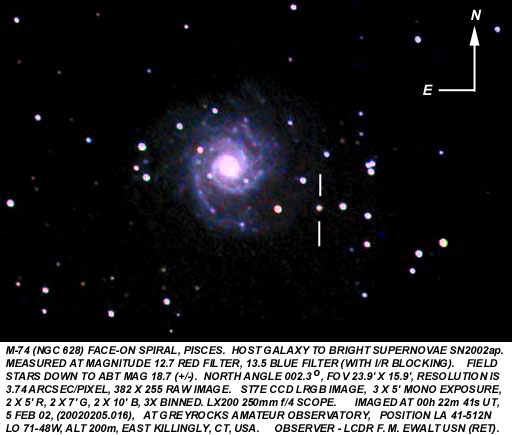 This page is devoted to information on Supernova 2002ap in M74 Basic information on this SN, including the last reported brightness, on this Supernova can be found on the main page.  Information on the original web pages for many of these images can be found on the updates and links web pages.