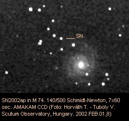 Because I have no time for further noting, I give here the location only: R.A. = 1h36m23s.85, Decl. = +15o45'13".0 (2000.0, the KAIT result), which is about 258" west and 108" south of the face-on spiral (SA(s)c) galaxy M74 = NGC 628 in Pisces. The KAIT image can be seen at: http://astron.berkeley.edu/~bait/2002/sn2002ap.gif , and the chart can be found at AAVSO: http://www.aavso.org/charts/PSC/SN2002AP/ .