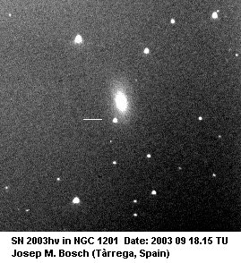 This page is devoted to information on Supernova 2003hv in NGC 1201.   Basic information on this SN, including the last reported brightness, on this Supernova can be found on the main page.  Information on the original web pages for many of these images can be found on the updates and links web pages.