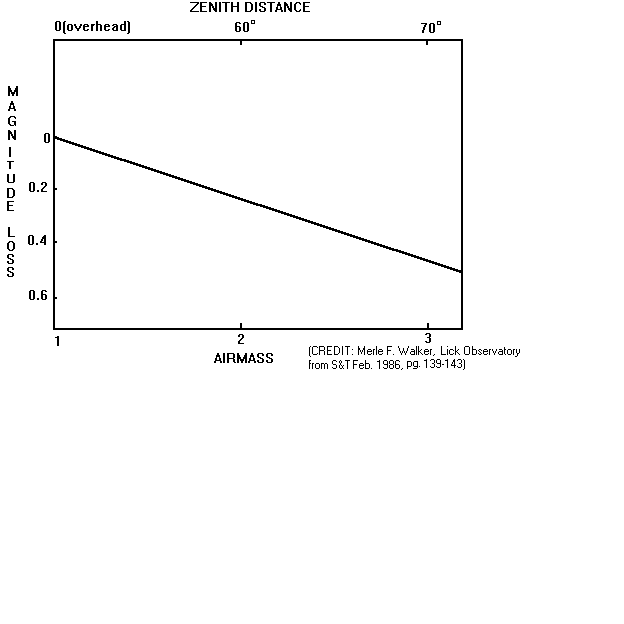 PERSONAL EQUATION (Systematic)This includes: the telescope (aperture, quality of optics, position angle equation[see below]), seeing conditions of the site used to make the observation (rural or urban; dark or light polluted), weather conditions (humid or cold), the ability of the observer (number of years observing, color determination, sensitivity, etc.), the age of the observer young or older and (this is not included in too many studies of personal equation), the attitude of the observer at the time of the observation (stressed, relaxed, hard day at the work place, mother-in-law in town for her annual visit, mother-in-law leaving town from her annual visit CHARTS (Random)Currently there are many sources(1) which can assist the observer in not only making magnitude estimates of a newly found supernova, but can also help determine if a suspect star is a possible supernova candidate (4)(5)(6)(7)(8)(9). Other comparison charts can be obtained from the AAVSO, UK Supernova Patrol, and the M-1 Supernova Network (Madrid)(Also see SN CHARTS for additional sources). If you have access to a university library, articles written over the years concerning past SNe events will also give very detailed information on photometry, light curves, and the mechanics involved concerning the event and will usually include many comparison stars. OTHER METHODS OF OBTAINING REFERENCE MATERIAL RELATING TO STARFIELDS.This process has been used for years by the master visual supernova discoverer...The Rev. Robert O. Evans of Coonabarabran, Australia. In fact his inspiration has been passed on to Dana Patchick of California (discoverer, 1987L) who accomplished a similiar feat....this utility is the photographing of the Palomar Sky Survey (in Rev. Evans case additional surveys were also made available to him) into a slide format! The idea is to have access to an astronomical library that has a collection of the POSS (Palomar Sky Survey) plates, then construct a macro lens attached to a 35mm-camera to accomplish close-up views and snapshots of individual galaxies. In proceeding in this manner you cut down on the costs of actually having to purchase the charts (available from Cal-Tech for $36 for six-6x6 degree copies of the POSS plates[note: this price may have gone up, but that was the price a few years ago][Ed. Note: The acquistion of these plate copies for the entire Virgo area can be obtained in 4 sets (of six), and the work of enlarging to snapshot-size charts may then be accomplished at ones leisure, this then breaks down to pennies per galaxy]. Rev. Evans has thousands of such slides, Dana has spent a year getting several hundred to a thousand images for use at the telescope and for reference. The main idea for this project was to have a ready reference available in the event some star was spotted that appeared "out of place" near or involved in some galaxy. Like any experienced observer these gentlemen have enough skill to be able to visually estimate [within a few tenths of a magnitude] a particular star. (that is why the Experienced observer would stand a better chance at this project than one who is not familiar with making magnitude estimates). While this regimen has some pitfalls it will give the observer some satisfaction that he is able to "weed" out any stars that might already exist near some galaxy, and that he will not have to call someone long distance on the telephone, or energize a verification team to verify some spurrious object....in essence you then become somewhat self-sufficient in the verification department. MAKING ESTIMATES.....A SUGGESTIONThere are many unavoidable criteria that must be considered in making a valid magnitude estimate, some will be suggested here, however the professional community will be better apt in determining some exacting standards of these values. One must consider that a SN suspect will, to the visual observer (or CCD imager) appear simply as an additional point of light in a particular galactic starfield. But to the professional astronomer Galactic Absorption (7)(10) or the amount of reddening along our line of sight to the host galaxy must be obtained, as well as Internal Absorption(8)(11)(12)(13), or the amount of absorption contained within the various galaxies where these events takes place. Other values also include where in the galaxy the event occurs. Absorption values might, for instance be higher if the event takes place within an HII region, etc. (The recent SN 1994I in M51 [NGC 5194]) displayed a more subluminous posture, possibly due to this fact absorption was ~1.8 higher along our line of sight to the event). (Ed. Note: SN 1994I was designated a type Ic SN, which as noted in(14),followed a slower decay than the mean type Ia, could absorption have been the culprit, or where different explosive scenarios at work here?).(Additionally, one should keep in mind that when making magnitude comparisons using CCD imaging to adhere to the following suggestion from B.Skiff [Lowell Observatory].."it should be noted once again that in principle there is no way to transform data for emission-line objects like novae and supernovae to any standard photometric scale based on ordinary stars. The spectra are simply too dissimilar to avoid systematic errors between different filter/detector combinations. The problem is most acute toward the blue, but workable with broadband filters in the red---as long as each system is well calibrated..."(message to Novanet, 3/7/95). So what criteria should the visual/CCD observer take into consideration? Firstly, (although perhaps not of too much consequence). Atmospheric Extinction can be factored in (15) determining the displacement in degrees from the zenith...using the formula: POSITION ANGLE EQUATION (From15a)(Mr. David Williams indicates suggestions relating to estimating visual magnitudes by demonstrating a personal positional angle test that he performed). Angle error in making visual estimations arise from the physiology o