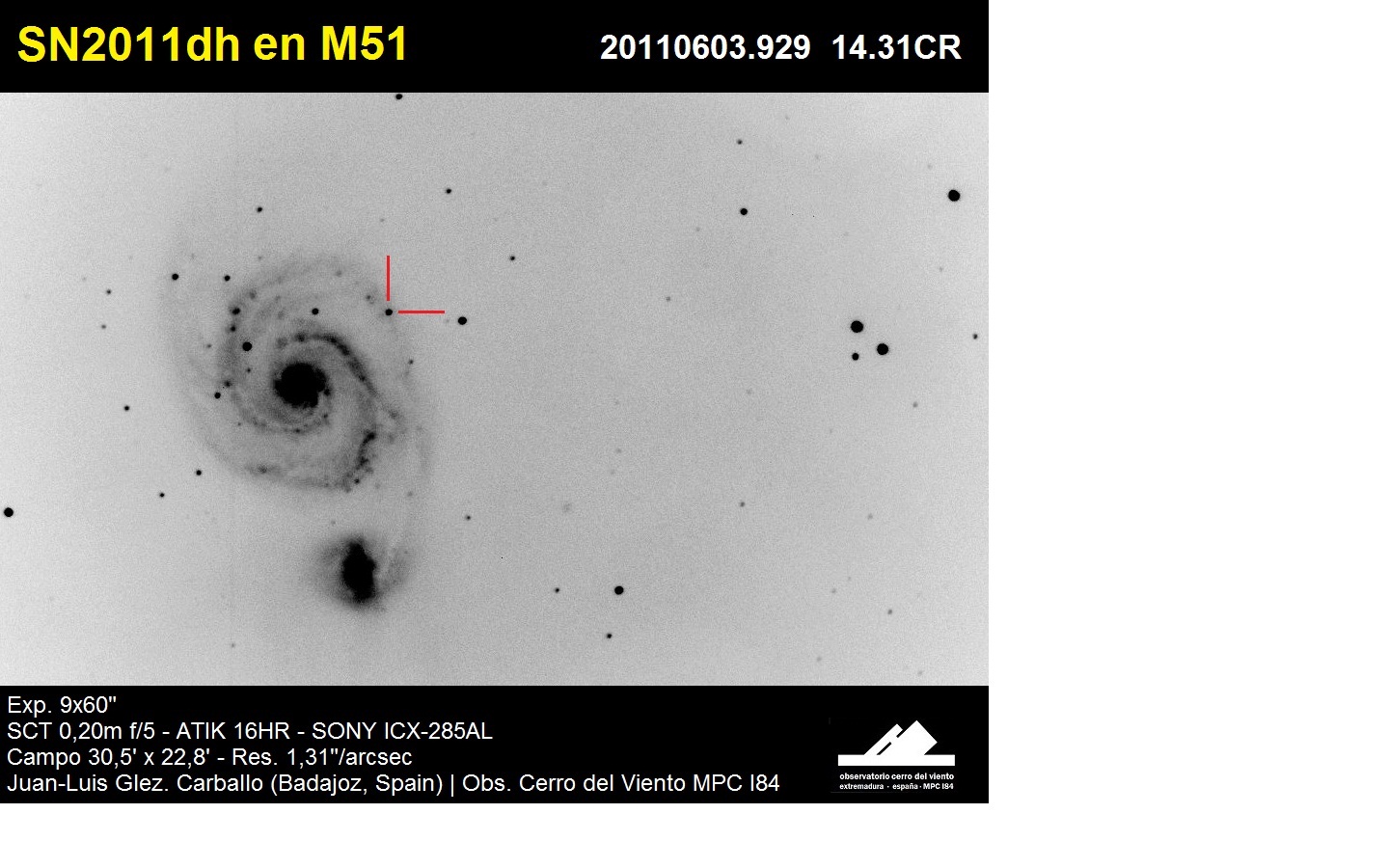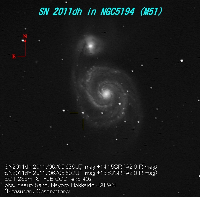 This page is devoted to information on Supernova 2011dh in M51. Basic information on this SN, including the last reported brightness, on this Supernova can be found on the main page. Information on the original web pages for many of these images can be found on the links web page.