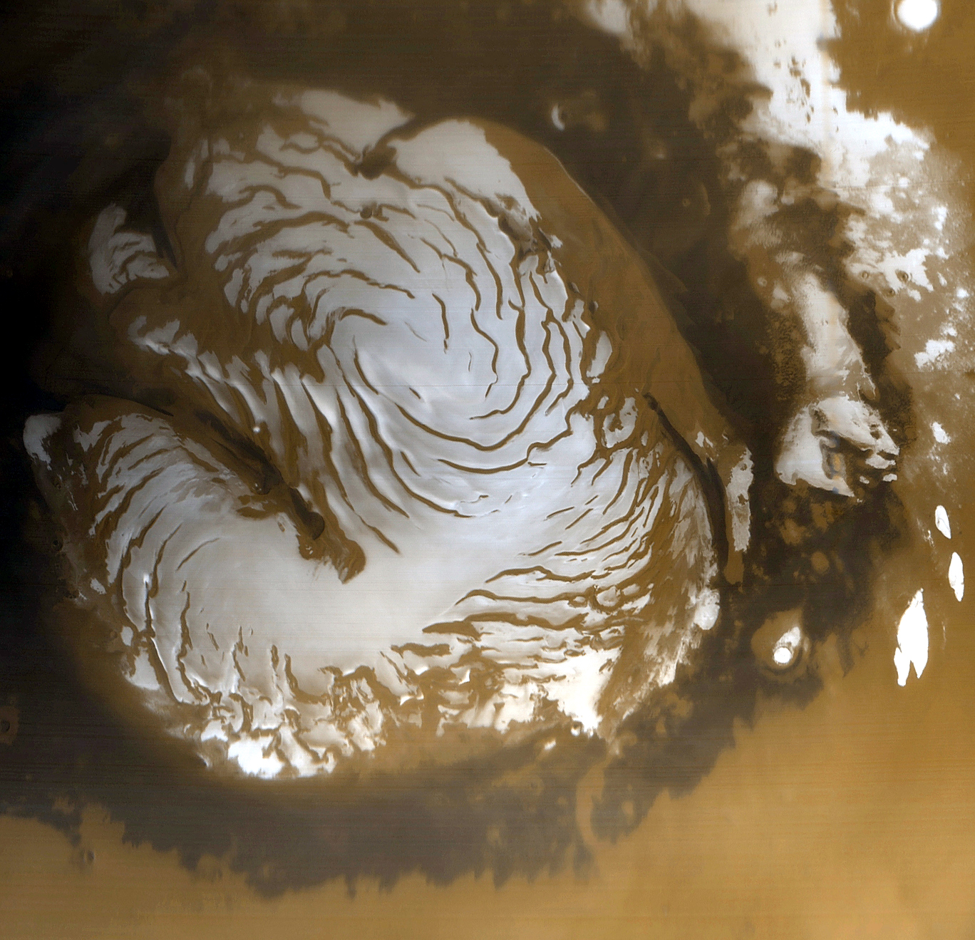 шапки видно темное кольцо. Это, в основном, дюны, образованные ветром.