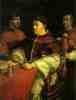 It was for this achievement that Raphael has remained famous throughout the centuries. Perhaps those who connect his name only with beautiful Madonnas and idealized figures from the classical world may even be surprised to see Raphael's portrait of his great patron Pope Leo X of the Medici family, in the company of two cardinals. There is nothing idealized in the slightly puffed head of the near- sighted Pope, who has just examined an old manuscript (somewhat similar in style and period to the Queen Mary's Psalter. The velvets and damasks in their various rich tones add to the atmosphere of pomp and power, but one can well imagine that these men are not at ease. These were troubled times, for we remember that at the very period when this portrait was painted Luther had attacked the Pope for the way he raised money for the new St Peter's. It so happens that it was Raphael himself whom Leo X had put in charge of this building enterprise after Bramante had died in 1514, and thus he had also become an architect, designing churches, villas and palaces and studying the ruins of ancient Rome. Unlike his great rival Michelangelo, though, he got on well with people and could keep a busy workshop going. Thanks to his sociable qualities the scholars and dignitaries of the papal court made him their companion. There was even talk of his being made a cardinal when he died on his thirty-seventh birthday, almost as young as Mozart, having crammed into his brief life an astonishing diversity of artistic achievements.