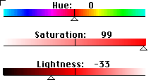 Think of the Hue slider as "WHICH Color" and the above rainbow shows where each color falls. (somebody running the ResEdit Power Tips section ought to add this right into the dialog, although one gets to remember by heart where they fall fairly quickly). As you see, it wakes up on red, and turquoise cyan lies at either end of the spectrum.