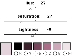 Note also that the settings are `relative' rather than absolute: if you exit the dialog with the `red cherry' setting and return you will find all nine sliders set to 0 again, waiting for you to set further relative offsets of the color components.