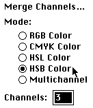 Anyway, as soon as you click ok, the windows will disappear and a new one will pop up in the upper left somewhere. You now have an HSB image and see one channel at a time. You can use Mode > Channel to verify and look at each channel (command 1,2,3 as a short cut).