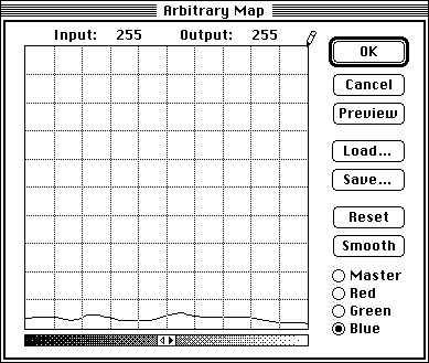 Old tip > On a 24-bit card you need to use option-Preview to get the realtime mode back. Clicking in the title bar (on the word "Arbitrary Map") will momentarily compare to the before settings, Option-Cancel will do a reset in all 4. ("Reset" itself only resets R,G,B or Master.) If you use Load/Save add a prefix or suffix (".arbmap") since there are lots of loadable files in PS. SuperBoomerang is nice for stuff like this, remembering the last chronological list of files and graying out other formats)